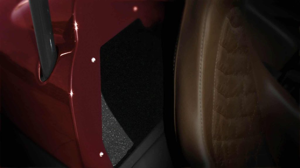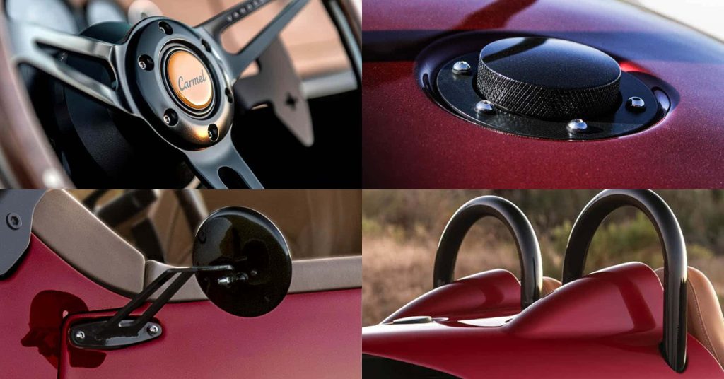 Gloss black hoops, gas cap, steering wheel and mirror uprights elegantly trim the Carmel GTS.